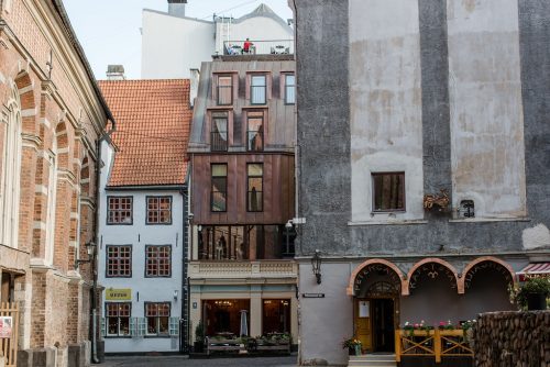 C eltnes autors ir arhitekts K. Felsko. Precīzs ēkas celšanas gads skaidri nav zināms. Pirmais attēls, kurā redzama māja datēts ar 1823. gadu. Šajā attēlā ēka parādīta, kā četrstāvu noliktavas ēka ar preču pacelšanas ierīci ēkas centrā un diviem stāviem jumtā. Jumta mansarda, dēļ šīs ēkas celšanas laiks vērtējams kā 18. gadsimta sākums. 1892. gadā māja tiek pārbūvēta par dzīvojamo ēku. Pirmā stāva fasāde tiek mainīta, un māja iegūst arkas veida logus, kas kalpoja par veikala vitrīnām. 1922. gadā tiek pārveidota 1.stāva ieeja veikalā un māja iegūst šī brīža izskatu.
